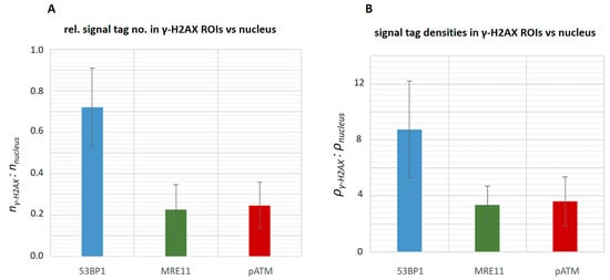 Analysis of the Ripley pair-wise distance-frequency curves in the γ-H2AX ROIs and comparison with the corresponding curves for the whole nucleus revealed that the 53BP1 peak is strongly associated with the γ-H2AX ROIs, which is reflected in more than 70% of the 53BP1 signals being located within the γ-H2AX ROIs (Figure 6A). The small 53BP1 clusters represented by the peak at about 50 nm, especially in animal P201 (Figure 4A), could not significantly be associated with the γ-H2AX ROIs. In contrast to that, the MRE11 and pATM peaks (Figure 4) were strongly related to γ-H2AX ROIs, with 23% of MRE11 signal tags and 25% of the pATM signal tags being located inside the γ-H2AX ROIs (Figure 6A).