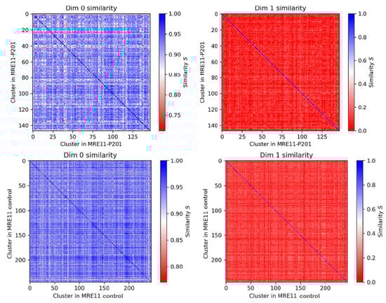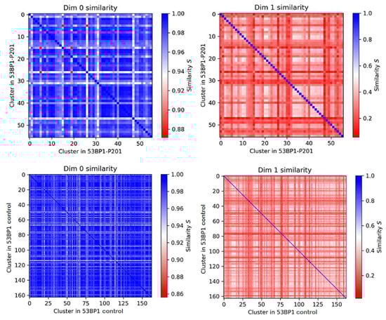 Examples of similarity heatmaps for topological features of 53BP1 and MRE11 signal tag nanoclusters in γ-H2AX damage areas in minipig (P201) keratinocyte nuclei and LCL control cell nuclei. Note, that in general, the similarity of the components is overestimated (dim 0), while the similarity for the holes (dim 1) is much lower.