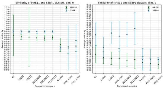 Figure 9 compares the average similarity values (Jaccard indices) among the different cells and animals investigated. These features were compared to the nano-organization of DSB damage cluster tracks of alpha-irradiated lymphocytes (taken from []). For the components (dimension 0), a very high similarity was observed for 53BP1 and MRE11 signal tag nanocluster distributions among the LCL control nuclei and keratinocyte nuclei of both minipig samples. However, the similarity values were reduced when comparing the former with the nano-organization of DDR proteins in high LET α-particle induced DSB damage tracks (Figure 9). For the holes (dimension 1), this effect was only observed for 53BP1, while for MRE11 the similarity values did not change considerably. The similarity values of the hole dimensions (dim 1) for 53BP1 were relatively equal for the LCL control and among the animals P201 and P212, suggesting a similar chromatin organization among the low LET-induced damage regions.