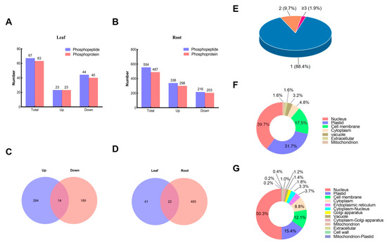The DEPPs and DEPs from Glycine max leaf and root samples under sodium bicarbonate stress. (A) Statistics of the sodium bicarbonate stress-responsive DEPPs and DEPs from Glycine max leaf samples; (B) statistics of the sodium bicarbonate stress-responsive DEPPs and DEPs from Glycine max root samples; (C) overlap of up-regulated DEPs and down-regulated DEPs identified in Glycine max root samples under sodium bicarbonate stress; (D) overlap of the DEPs in leaf samples and the DEPs in root samples; (E) the percentage distribution of DEPPs in one DEP from Glycine max roots and leaves under sodium bicarbonate stress; (F) prediction of the subcellular localization of the sodium bicarbonate stress-responsive DEPs from Glycine max leaf samples; (G) prediction of the subcellular localization of sodium bicarbonate stress-responsive DEPs from Glycine max root samples. All phosphoproteomics data are based on biological triplicates.