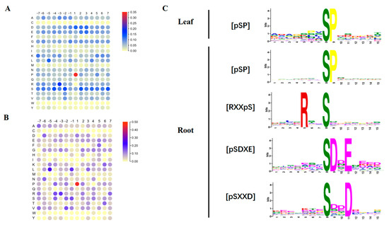 Analyses of the phosphosite flanking sequences. (A) The heatmap for the distribution of amino acids in flanking sequences of p-Ser phosphosites. The heatmap was constructed based on 503 unique p-Ser phosphosites; (B) the heatmap for the distribution of amino acids in flanking sequences of p-Thr phosphosites. The heatmap was constructed based on 44 unique p-Thr phosphosites; (C) the sequence logos of the significantly enriched phosphor motifs extracted from the DEPPs in response to sodium bicarbonate stress in soybean leaf and root tissues. The sequence logos were depicted based on 59 or 460 unique p-Ser phosphosites identified in leaf or root tissues.