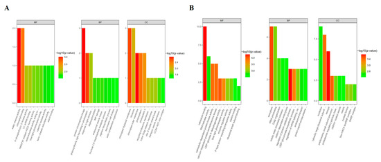 GO analysis of the DEPs from Glycine max roots and leaves under sodium bicarbonate stress. (A) Leaf samples; (B) root samples.
