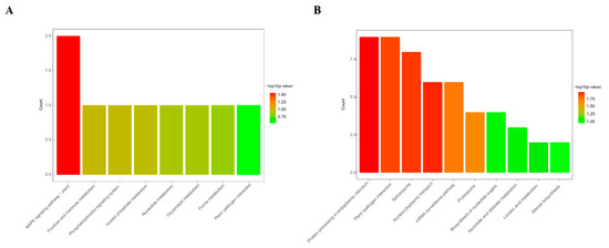 For the KEGG pathway analysis (Figure 5 and Tables S8 and S9), in the case of leaf tissue, the MAPK signaling pathway (gmx04016) is the only statistically significantly enriched (p-value < 0.05) KEGG pathway, in which two DEPs (I1KBU7 and I1L345) were involved. However, in the case of root tissue, six statistically significant KEGG pathways were enriched. Nine DEPs (C6T1E8, I1LIQ4, I1K3U6, I1JLS5, C6T7K0, I1KMB9, I1JPP3, A0A0R0KAL0, and I1LEX5) were involved in protein processing in endoplasmic reticulum (gmx04141), nine DEPs (A0A0R0HX26, C6TDV2, P28583, I1JNE0, I1MR60, I1MC08, I1KKF7, K7N5A2, and I1K313) were involved in plant–pathogen interactions (gmx04626), eight DEPs (I1KR32, K7MP06, I1JAI4, I1MRC7, C6T8C8, I1JAG0, I1MYV2, and I1LMC1) were involved in spliceosome (gmx03040), six DEPs (I1JAG0, I1MYV2, I1LQL7, I1LMC1, A0A368UGP3, and I1NGB7) were involved in nucleocytoplasmic transport (gmx03013), six DEPs (I1JAG0, I1MYV2, A0A0R0HUD3, I1L3K1, I1LQL7, and I1LMC1) were involved in the mRNA surveillance pathway (gmx03015), and four DEPs (I1LS70, I1K5H2, C6TGJ3, and I1KQE8) were involved in the proteasome (gmx03050). These results indicate that under sodium bicarbonate stress, the DEPs identified in root tissues could regulate more metabolic pathways than the DEPs in leaf tissues. Moreover, our results reveal the importance of soybean roots in the response to sodium bicarbonate stress, and they may also offer new insights into the different above- and belowground organ-specific responses to abiotic stresses in plants.