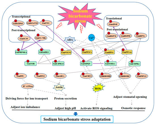 In summary, according to the results presented in this study and the related references, we propose a working model (Figure 7) for the response of soybean plants to sodium bicarbonate stress revealed by phosphoproteomics in the leaf and root tissues. Sodium bicarbonate stress firstly causes phosphorylation of a series of K/Ps in cells, possibly through Ca2+- or ABA-mediated signaling cascades, and then the phosphorylation levels of substrate proteins like transcription factors (GmbZIP63, GmbZAT10, GmYY1), splicing factors (GmSC35, etc.), initiation factors (GmeIF4Fc, etc.), chaperones (GmHSP70 and GmHSP90), and 26S proteasome subunits (GmRPNs) are altered to influence the expression levels of more genes on transcriptional/post-transcriptional and/or translational/post-translational/protein degradation levels. In addition, under sodium bicarbonate stress, the activation of the proton pump (H+-ATPase) provides a driving force for ion transport, thereby helping to adjust the ion imbalance caused by sodium bicarbonate stress. Proton efflux is also helpful to reduce the high pH. Similarly, GmPIN2- and GmABC-transporter-mediated auxin efflux also helps to reduce high pH stress. Moreover, sodium bicarbonate stress activates the ROS signaling cascades by phosphorylating GmCRY2 and GmRBOH oxides and alleviates osmotic stress by adjusting stomatal opening. Altogether, the activated pathways lead to soybean adaptation to sodium bicarbonate stress.