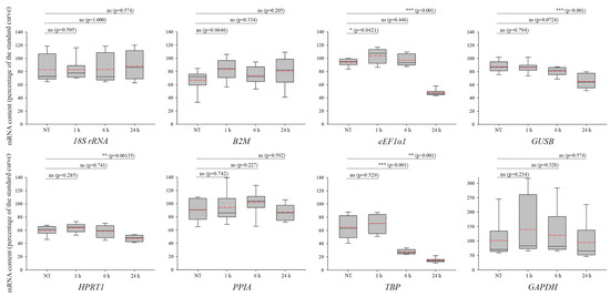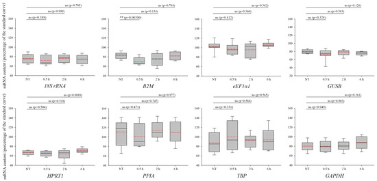 Figure 1. Expression changes in the proposed reference genes upon ultraviolet (UV) B irradiation. mRNA levels of 18S rRNA, B2M, eEF1α1, GAPDH, GUSB, HPRT1, PPIA, and TBP are shown in the panels 0.5, 2, and 6 h following UVB irradiation, as well as in non-treated (NT) samples. In each box, the median value is depicted by the solid black line, while the mean value is represented by the red dashed line. The standard error of the mean (SEM) displays the variations of 4 independent biological replicates. The “ns” indicates non-significant (p > 0.05), whereas asterisk(s) indicate(s) statistical significance between the NT and the treated samples (** p < 0.01).