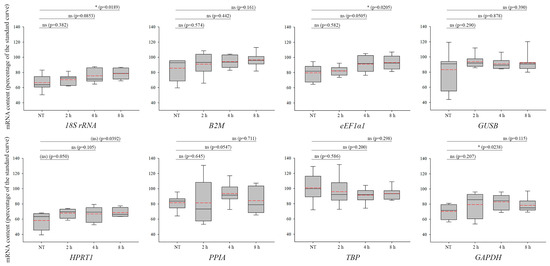 Figure 2. Changes in the expression level of the candidate reference genes as a result of neocarzinostatin (NCS) treatment. mRNA levels of 18S rRNA, B2M, eEF1α1, GAPDH, GUSB, HPRT1, PPIA, and TBP are shown in the panels 2, 4, and 8 h following NCS treatment, as well as in the NT samples. In each box, the median value is depicted by the solid black line, while the mean value is represented by the red dashed line. SEM represents the variations in 4 independent biological replicates. The “ns” indicates non-significant (p > 0.05), whereas asterisk(s) indicate(s) statistical significance between the NT and the treated samples (* p <  0.05). Brackets indicate the cases where only 2 of the 3 statistical programs gave consistent results.