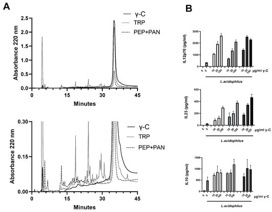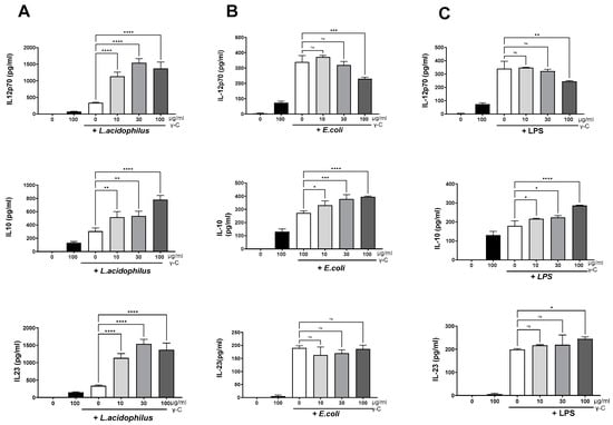 All three microbial stimuli-induced IL-12, IL-10, and IL-23 concentrations were around 300 pg/mL. Treatment with γ-C (10–100 µg/mL) prior to stimulation with L. acidophilus NCFM led to a three-fold increase of the IL-12, Figure 1A. The concentration of IL-23 showed a similar increase upon treatment with γ-C, while the increase in IL-10 was two-fold (Figure 1A). In contrast, γ-C added prior to stimulation with LPS or E. coli Nissle 1917 showed a decreasing effect on the IL-12 production at the highest concentration of γ-C (100 µg/mL), did not affect the IL-23 production, and showed a moderate dose-dependent increase in IL-10 production (Figure 1B,C).