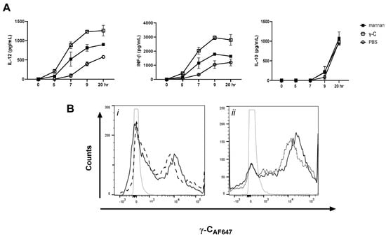 To study the putative role of the mannose receptor in the endocytosis of γ-C, DCs were added, either mannan or dextran, both shown to bind to MR [,,]. This was followed by the addition of AF657-labeled γ-C (Figure 3B). Compared to cells only, added AF657-labeled γ-C both mannan (i) and dextran (ii) reduced the intensity of AF-657 in DCs as measured by flow cytometry. Together, these results suggest that the mannose receptor may play a role in the enhanced IL-12 response by γ-C. We cannot, however, exclude that other endocytosing receptors on DCs, e.g., scavenger receptors (ScRs), may contribute to the endocytosis of γ-C.