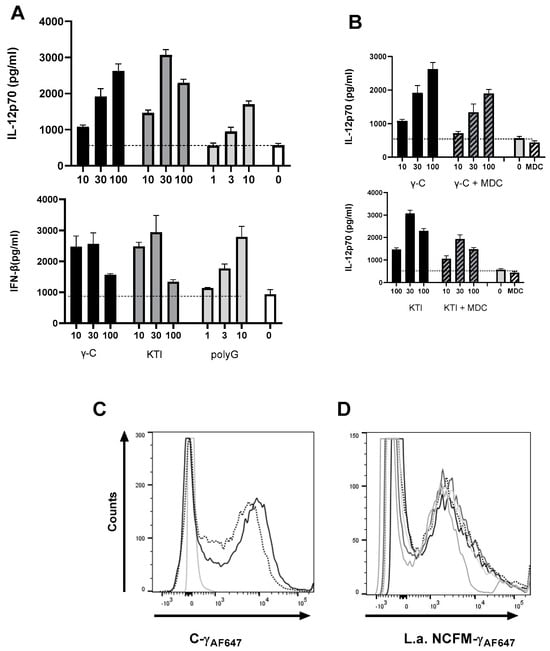 KTI and polyG as good as γ-C in enhancing LaNCFM-induced IL-12. (A): Effect of increasing concentrations of γ-C and KTI (10, 30, and 100 µg/mL) and of PolyG (1, 3, and 10 µg/mL) on L. acidophilus NCFM-induced IL-12 and IFN-β production. The stippled line indicates the cytokine level after stimulation with LaNCFM with no protein added. (B): Effect of monodansyl cadaverine (MDC) on the C-γ- or KTI-enhanced IL-12 response in bmDCs stimulated with L. acidophilus NCFM. MDC was added to the cells 60 min and C-γ or KTI (10, 30 and 100 µg/mL) 30 min prior to stimulation with L. acidophilus NCFM. The stippled line indicates the cytokine level after stimulation with LaNCFM with no protein or MDC added. (C): Effect of MDC on the uptake of fluorescently labeled γ-C (γ-CAF657) in bmDCs. MDC (dotted) or media (solid) was added to bmDCs 30 min prior to γ-CAF657. After an additional 30 min of incubation, the intensity of fluorescence in each cell was measured by flow cytometry. (D): γ-C and KTI do not affect uptake of L. acidophilus NCFM. The proteins (100 µg/mL) ((γ-C (black), KTI (dark grey), CytD (grey), Nystatin (light grey), media (dotted)) were added 30 min prior to addition of AF567-labeled L. acidophilus NCFM (L.a.NCFMAF657). Cells were analyzed by flow cytometry after 1 h of incubation.