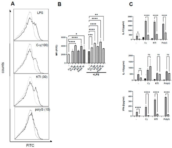 ROS production is induced by γ-C, KTI, and PolyG and may be involved in the enhanced IL-12 and IFN-β. (A): Histograms of cells incubated with carboxy-H2DCFDA prior to treatment with LPS (100 ng/mL), γ-C (100 µg/mL), KTI (30 µg/mL), or PolyG (10 µg/mL) for 30 min or left untreated. (B): Bar graph showing the mean fluorescence I = intensity (MFI) of cells incubated with carboxy-H2DCFDA and pre-treated with γ-C (10 or 100 µg/mL, light grey), KTI (10 or 30 µg/mL, gray), or PolyG (10 µg/mL, dark gray) with (hatched bars) or without addition of LPS (1 µg/mL). (C): Cytokine concentration of supernatant from DCs treated with (gray hatched bars) or without (gray bars) apocynin, then pre-incubated with γ-C, KTI, or polyG and stimulated L. acidophilus NCFM. Cells with added proteins without stimulation with L. acidophilus NCFM are shown as black bars. * p < 0.05, ** p < 0.01, *** p < 0.001, **** p < 0.0001, ns: not significant.