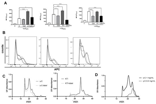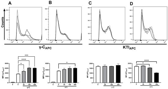 At high γ-C concentrations, more labeled γ-C is endocytosed. Labeled γ-C (A,B) or labeled KTI (C,D) was added alone or together with increasing concentrations of unlabeled γ-C (A,D) or unlabeled KTI (B,C). In each panel, the figures in (A) depict the histogram of each combination at the indicated concentration of unlabeled protein; 0 µg/mL (dotted), 30 µg/mL (light gray), 100 (dark gray), and 300 µg/mL (black), and in (B): the average MFI of each concentration (0–300 µg/mL) of added unlabeled protein to the indicated labeled protein. * p < 0.05, *** p < 0.001, **** p < 0.0001.