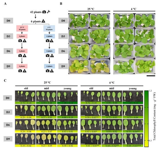 indicate imaging, harvesting, and freezing of plant/leaf samples, respectively. (B) Morphological phenotype of the Pak Choi plants on the harvesting day (D0) and on day 3 (D3), day 6 (D6), and day 9 (D9) after storage at 4 °C and 25 °C under dark conditions. Plants stored at 4 °C showed a delayed dark-induced senescence and remained green. Scale bar, 10 cm. (C) Images (top) and total chlorophyll content (bottom) of the leaves categorized as old (leaves 1–4), mid (leaves 5–8), and young (leaves 7–12) on D0, D3, D6, and D9. Scale bars, 5 cm. The treatments were carried out thrice, and the representative images from these three independent experiments are shown. For total chlorophyll analysis, data are mean ± SD, n = 6. The statistical significance of the 4 °C treatment compared to the 25 °C treatment was determined by a two-tailed t-test (* p < 0.05, ** p < 0.01, and *** p < 0.001). The p-values are given in Supplementary Table S2.