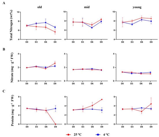 N stands out as a pivotal element that is remobilized in massive quantities during natural senescence []. To understand more about N assimilation and remobilization during post-harvest leaf senescence, we checked the levels of total nitrogen, nitrate, and protein content in old, mid, and young leaves of Pak Choi plants on D0 and on D3, D6, and D9 after storage at 4 °C and 25 °C. In the old leaves of plants stored at 25 °C, the total N content decreased persistently with time (Figure 2A). Inversely, in the young leaves of the same plants, the total N content increased until D6 and remained high on D9. In the middle leaves, the levels of total N remained nearly constant throughout the study period. Consistent with the lack of leaf senescence and obviating the need for N remobilization, the reverse trend could be observed in plants stored at 4 °C - the total N content increased in the old leaves with time. On D9 of 4 °C storage, the total N content in the old leaves showed signs of decreasing, which might be indicative of the initiation of leaf senescence (Figure 2A).