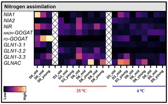Once nitrate transporters import nitrate ions from roots, nitrate reductases convert these ions into nitrite ions, which are then converted into ammonium ions by nitrite reductases. Since these genes play a critical role in N assimilation in plants, we examined their transcript levels via qRT-PCR. It is important to note that the old leaves from plants that were stored at 25 °C for 9 days (D9 old) were not included in the qRT-PCR study, as the quality of the RNA isolated from those samples was poor. Differentially expressed genes between 4 °C and 25 °C are shown in Figure 3. Upon analyzing the expression of nitrate reductases and nitrite reductases, we observed that the nitrate reductase NIA1 was highly expressed in the old and mid leaves on D0. However, its transcripts were completely suppressed in all leaves stored at 25 °C from D3 (Figure 3). In contrast, a delay in the suppression of NIA1 transcripts was detected in plants stored at 4 °C. Interestingly, NIA2 was not expressed on D0, but its expression began to increase gradually in old leaves stored at 25 °C on both D3 and D6. It is important to note that, in Arabidopsis, of the two NIA genes, NIA1 was highly upregulated and NIA2 remained unchanged during natural leaf senescence [], whereas, in post-harvest senescent Pak Choi leaves, the mRNA levels of NIA1 were found to be decreased, and mRNA levels of NIA2 were increased.
