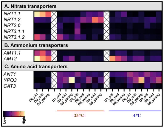 On the other hand, NRT1.2 had a low expression in D0 samples and in all samples stored at 4 °C. But in samples stored at 25 °C, its expression was significantly induced by D9, as shown in Figure 4A. Once again, the mRNA levels of NRT1.2 under post-harvest conditions were different from natural senescence, where it was unaffected []. Furthermore, NRT2.6 and NRT3.1 were differentially expressed in senescing leaves (Figure 4A). While NRT2.6 has been shown to mediate nitrate transport in Xenopus oocytes [], its specific functions in planta remain undefined. An association between AtNRT2.6 activity and the production of reactive oxygen species has been observed in response to the redox-active herbicide methyl viologen, hinting at potential stress-related roles []. In plants stored at 25 °C, mRNAs of NRT2.6 and NRT3.1.1 were not detected on D0, but in post-harvest plants, they were exclusively induced in the old leaves on D3 and D6 (Figure 4A). However, NRT3.1.2 showed a high expression in D0 samples, and their transcript levels were drastically reduced upon storage at both 4 °C and 25 °C (Figure 4A). Unlike natural senescence conditions, a key common observation under post-harvest conditions is that most nitrate transporters are deactivated, which might be attributed to the absence of the remobilization of the nitrate ion.