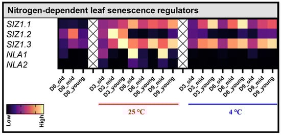 Effect of the post-harvest storage temperature on transcript levels of nitrogen-dependent leaf senescence regulators SIZ1 and NLA. Transcript levels of genes involved in regulation of leaf senescence in old (leaves 1–4), mid (leaves 5–8), and young (leaves 8–12) leaves were analyzed on the harvesting day (D0) and on day 3 (D3), day 6 (D6), and day 9 (D9) after storage at 4 °C and 25 °C under dark conditions. The expression levels shown are relative to the expression of Actin. Data are mean ± SD, n = 6. The statistical significance of the 4 °C treatment compared to the 25 °C treatment was determined by a two-tailed t-test, and the p-values are given in Supplementary Table S6.