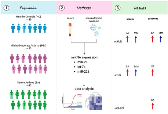 These microRNAs were evaluated both in serum and in exosomes isolated from the serum of asthma patients and compared with a group of healthy subjects in order to better understand how these small non-coding RNAs might play a role in asthma pathology.