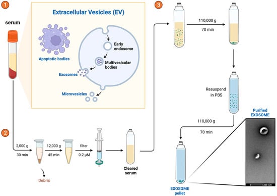 Exosomes were isolated from 250 µL of serum per patient by using serial centrifugation: 2000× g for 30 min to remove debris and thereafter 12,000× g for 45 min at 4 °C (Thermo Fisher Scientific, Waltham, MA, USA). The supernatant was filtered through a 0.22 µm filter (Corning®, Somerville, MA, USA), followed by an ultracentrifugation at 110,000× g for 70 min at 4 °C to pellet the exosomes (Beckman Coulter Optima L-90K Ultracentrifuge with Ti90 rotor; Beckman Coulter, Pasadena, CA, USA). The pellet was resuspended in 1 mL of PBS to wash it and ultracentrifuged again at 110,000× g for 70 min at 4 °C. The pellet was resuspended in 100 µL of PBS and frozen at −80 °C until use. All steps are described in Figure 2.