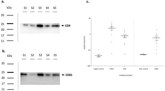 Subsequently, a flow cytometric analysis was performed (Figure 3c). The surface expression of CD9, CD63, and CD81 was higher in almost all analyzed exosomes when compared to isotypic controls.
