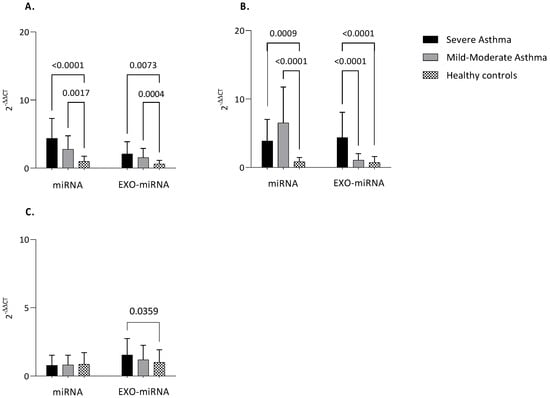 Notably, intracellular miR-21 was higher both in severe asthma and mild-to-moderate asthma compared to healthy controls (p < 0.0001; p = 0.0017). The same could be said about exosomal miR-21 (p = 0.0073; p = 0.0004) (Figure 4A).