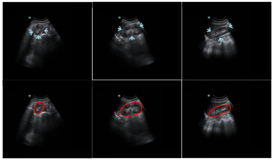 Example trans-abdominal US kidney images. Portions of the kidney boundary, pointed to by arrows, do not have high contrast with the surrounding tissue. The first column shows an axial image, and the second and third columns show sagittal images. The second row displays the corresponding ground truth of the original data in the first row. The red circles represent the contour manually delineated by the professional radiologists.