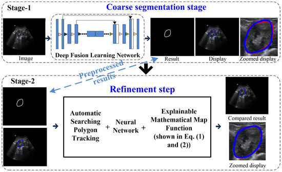 Our coarse-to-refinement-based method had two main components: (1) a coarse segmentation step and (2) a refinement step. The flowchart of our approach is shown in Figure 2. Stage 1 represents the deep fusion learning-based coarse segmentation stage, and Stage 2 is the refinement stage. In addition, the input and output of each stage of our developed system are displayed in Table 1, and all the notations are defined in the Appendix.