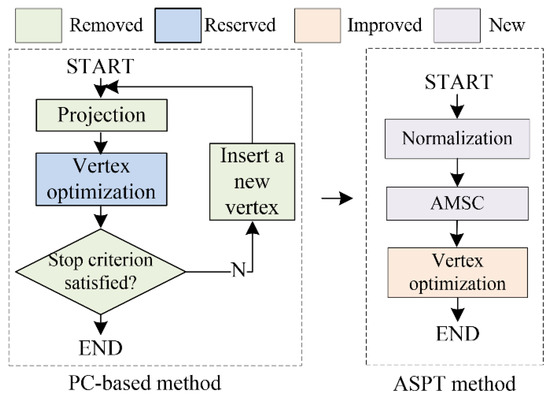 Difference between the standard PC-based method and our ASPT method. The main steps of the PC-based methods are projection, vertex optimization, and vertex addition. Unlike PC-based methods, our ASPT method only uses the newly added normalization and the adaptive MSC method while including a modified vertex optimization step.