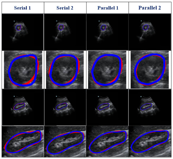Table 2 represents the testing outcomes of four variant models based on the DSC value. Figure 5 represents the visual qualitative results of the four variant models based on two randomly selected cases. Parallel architectures (Parallel 1 and 2) showed better performance than serial architectures (Serial 1 and 2), with DSC and Ω values of 0.89 and 0.899 and 0.805 and 0.813, respectively, for the two parallel architectures. However, compared with Parallel 1, the DSC and Ω values of Parallel 2 increased by 1.01% and 0.99%, respectively. Hence, we used Parallel 2 as the coarse segmentation step of our proposed method.