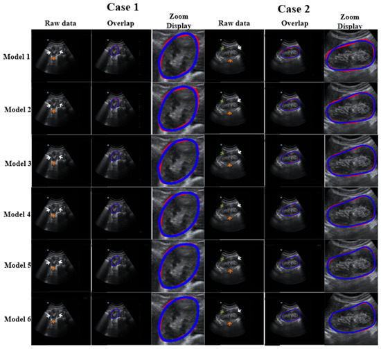 Ablation experiments were conducted to assess the influence of different components of our method. The ablation results are shown in Table 3. Figure 6 reports the visual comparisons using two representative cases. Compared with Model 1, the DSC and Ω of other models (with the refinement step) increased by 1.55–5.22% and 8.11–14.8%, respectively. In addition, for Models 2–6, the DSC values were higher than 91% and the standard deviations were lower than 6.5%. This demonstrates that the proposed refinement step can fine-tune the coarse segmentation outcomes. All in all, our model shows optimal capability.