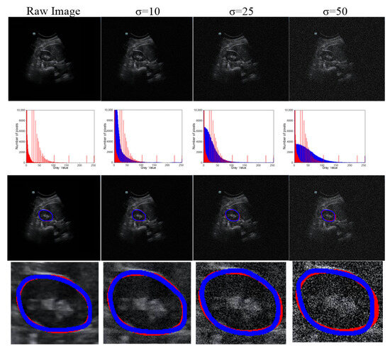 Robustness of our method under various degrees of Gaussian noise. Row 1, raw or noisy data; row 2, histograms of the raw or noisy images; row 3, the overlap between the GT and segmentation results; and row 4, corresponding zoomed-in results. The red line represents the GT, and the blue line represents the segmentation result.