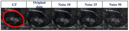 As US images are grayscale, most of the pixels are black and have a gray value of zero. To better distinguish the effect of other pixel points (gray value > 0), we only selected the number of pixels within the range [0, 10,000] in the image to show the distribution of pixel points with different gray values (Table 4 and Figure 7). When we added more Gaussian noise (σ increases), the number of pixels with gray values greater than 0 increased. This illustrates that the degree of damage to the original images increased. However, the DSC values were greater than 90% even for images with a severe level of noise (σ = 50). This indicates that the blurry boundaries were efficiently detected (Table 3 and Figure 7). Figure 8 shows zoomed-in images corresponding to those in Figure 7.