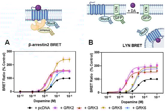 Importantly, our β-arrestin2 BRET recruitment assay only detects physical interactions between the D2R and β-arrestin2, not the functional responses resulting from this interaction. We thus examined D2R internalization as, upon agonist activation of numerous GPCRs including the D2R [32,33,34], β-arrestin2 will scaffold with the AP2/clathrin complex to promote receptor endocytosis. To measure D2R internalization, we used the LYN BRET assay depicted schematically in Figure 1B. This biosensor measures the decrease in BRET between the D2R and a plasma membrane-anchored protein (Lyn kinase) upon receptor internalization [35]. As with the β-arrestin2 recruitment results, dopamine stimulation promotes receptor internalization, and the overexpression of all GRK isoforms potentiates the efficacy (Emax) of the dopamine response (Figure 1B, Table 1). Further, the overexpression of GRK2 or GRK3, but not GRK5 or GRK6, promoted a dramatic increase in the potency (up to 55-fold) of dopamine for stimulating D2R internalization (Table 1). Taken together, these results suggest that while both subfamilies of GRKs are capable of potentiating D2R–β-arrestin2 interactions, and the subsequent receptor internalization, only the GRK2/3 subfamily can increase the potency of dopamine for promoting these effects.