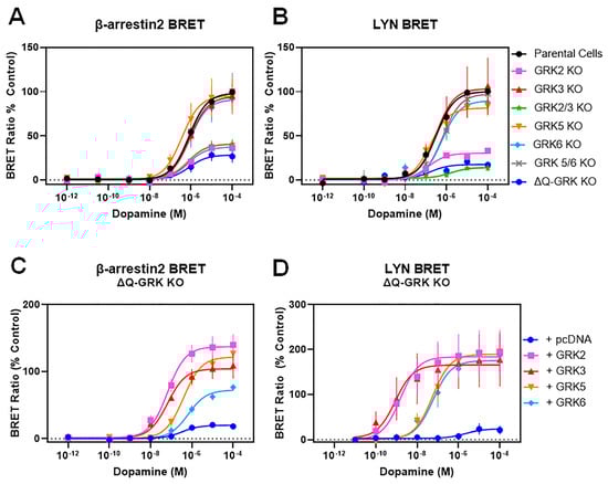Selective knockout of GRK isoforms reveals the critical role of GRK2 in modulating β-arrestin2 recruitment to the D2R as well as receptor internalization. β-arrestin2 BRET and LYN BRET assays were performed as described in Figure 1 and Section 2 using parental HEK293 cells or HEK293 cells in which the indicated GRK isoform(s) was/were deleted (KO) using CRISPR/Cas9 technology as described in Drube et al., 2022 [28] (Note that ΔQ-GRK KO refers to the simultaneous deletion of GRK2, GRK3, GRK5, and GRK6). (A) Concentration-response curves for dopamine stimulation of β-arrestin2-mVenus recruitment to D2R-Rluc8 using the β-arrestin2 BRET assay were generated as described in Figure 1 and Section 2. (B) Concentration-response curves for dopamine-stimulated receptor internalization using the LYN BRET assay were performed as described in Figure 1 and Section 2. (C) Plasmids expressing either GRK2, GRK3, GRK5, GRK6, or pcDNA (control) were transiently transfected into the ΔQ-GRK KO cell line and dopamine-stimulated β-arrestin2 recruitment was measured as described in panel (A). (D) Plasmids expressing either GRK2, GRK3, GRK5, GRK6, or pcDNA (control) were transiently transfected into the ΔQ-GRK KO cell line and dopamine-stimulated D2R internalization was measured as described in panel (B). Average curve parameters (EC50 and Emax values) and statistical comparisons are shown in Table 2 (panels (A,B)) and Table 3 (panels (C,D)). In all experiments, the data are expressed as a percentage of the maximum dopamine response observed in the parental HEK293 cells (data shown in Table 3) and are displayed as mean ± SEM values from at least three experiments.