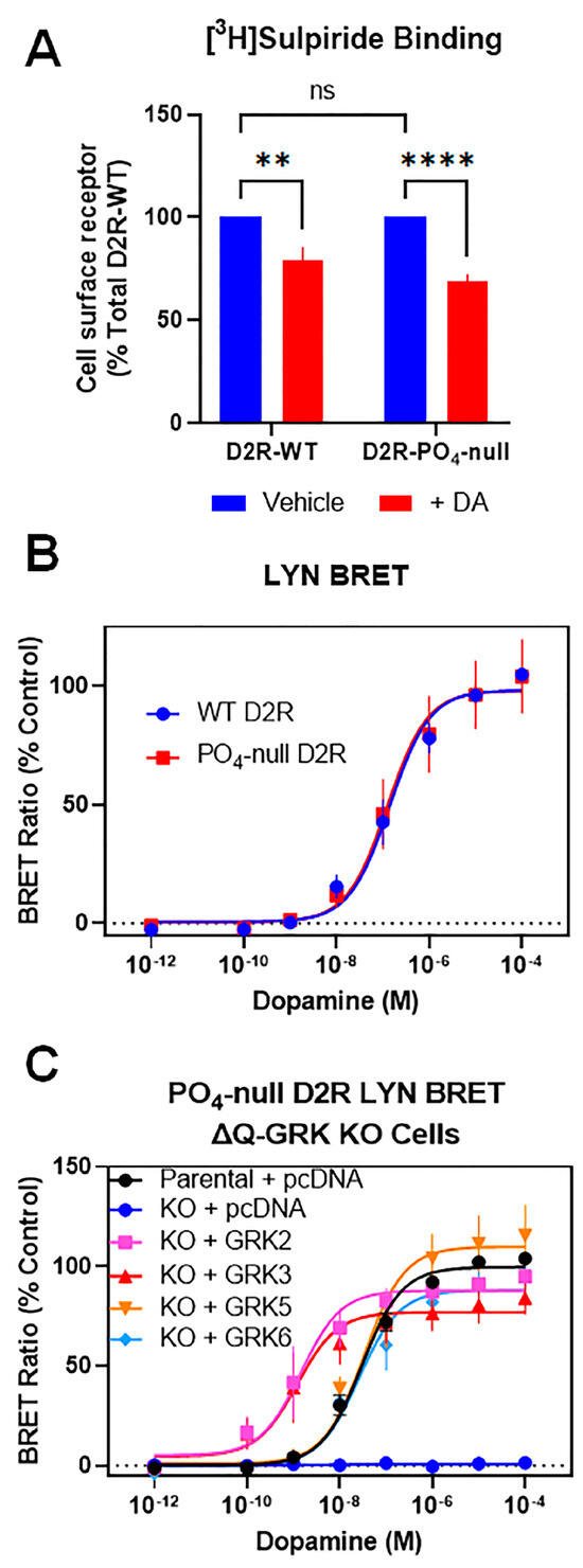 Cell culture media and reagents were purchased from Invitrogen (Carlsbad, CA, USA) and Corning (Glendale, AZ, USA). Cell culture flasks and all assay plates were purchased from ThermoFisher Scientific (Waltham, MA, USA) and Greiner Bio-One (Monroe, NC, USA). Dopamine was obtained from Sigma-Aldrich (St. Louis, MO, USA). [3H]-Sulpiride was purchased from Perkin Elmer Life Sciences (Waltham, MA, USA) or Novandi (Södertälje, Sweden). Compound 101 was purchased from Tocris Bioscience (Minneapolis, MN, USA). HEK293 cells originated from the American Type Culture Collection (Manassas, VA, USA). HEK293 cell lines in which the expression of individual or multiple GRK isoforms was eliminated using CRISPR/Cas9 technology were generated as described in Drube et al., 2022 [28]. Plasmid constructs expressing Gαo1-Rluc8, Gβ1, Gγ2-mVenus, CAMYEL biosensor, β-arrestin2-mVenus, and human D2R-Rluc8 were kind gifts from Drs. Jonathan Javitch and Hideaki Yano at Columbia University (New York, NY, USA). Plasmid constructs expressing GRK2-rGFP, LYN-rGFP, and β-arrestin2-Rluc2 were kind gifts from Dr. Michel Bouvier at the University of Montreal (Montreal, QC, Canada). Plasmid constructs for GRK2, GRK3, GRK5, and GRK6 were kind gifts from Dr. Jeffrey L. Benovic at Thomas Jefferson University (Philadelphia, PA, USA). Plasmid constructs consisting of Nanoluciferase fused to the C-terminus of β-arrestin2 along with FlAsH biosensors incorporated into different positions in β-arrestin2 (Nluc-β-arrestin2-FlAsH biosensors) were generated as previously described [29]. The plasmid expressing the phosphorylation-null (PO4-null) D2R was generated as described previously [17]. Experiments that directly compared WT and PO4-null D2R used rat D2RL (long isoform). Human D2RL (long isoform) was used in all other experiments. MiniComplete™ protease inhibitor mixture was purchased from Millipore Sigma (Burlington, MA, USA). Anti-GRK2 antibodies were from Santa Cruz Biotechnology (Dallas, TX, USA, sc-13143, mouse). Anti-GAPDH antibodies were from Proteintech (Rosemont, IL, USA, 10494-1-ap, rabbit). Horseradish peroxidase-conjugated anti-rabbit-IgG and anti-mouse-IgG were from Jackson ImmunoResearch Laboratories (West Grove, PA, USA, #111-035-003, #115-035-003).