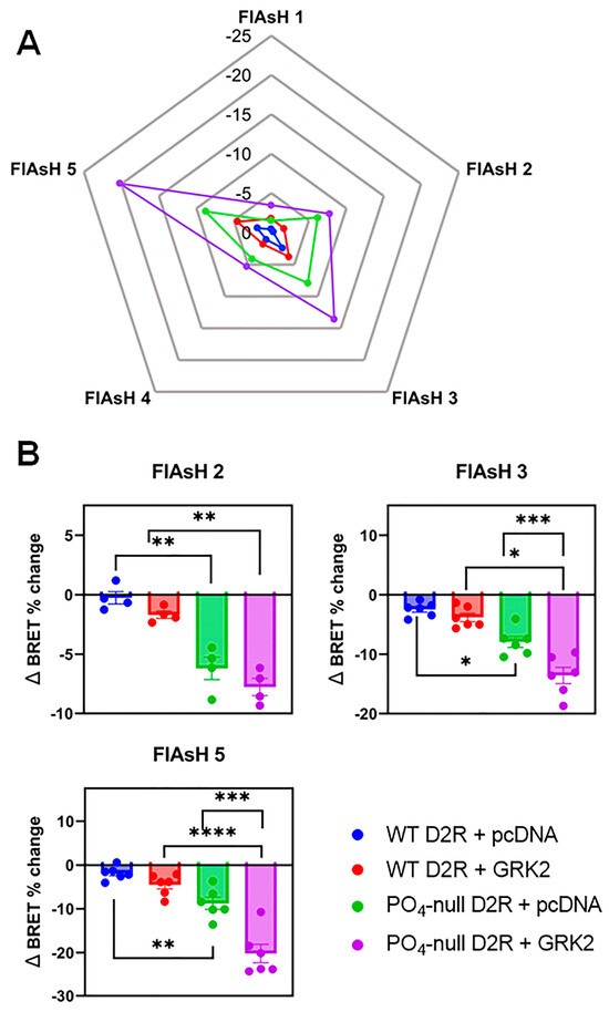 Dopamine-stimulated β-arrestin2 conformational changes are enhanced by GRK2 in the absence of receptor phosphorylation. HEK293 cells were transiently transfected with the indicated D2R construct, the indicated Nluc-β-arrestin2-FlAsH biosensor, and either pcDNA or the GRK2 construct as described in Section 2. These FlAsH biosensors [29] were used as described in Section 2 to detect conformational changes in β-arrestin2 following incubation with either vehicle or 100 µM dopamine for 15 min. The data are expressed as the Δ BRET % change. First, dopamine-stimulated net BRET was calculated by subtracting the BRET ratio of vehicle-treated cells from the BRET ratio of dopamine-treated cells. This value was then divided by the BRET ratio of vehicle-treated cells and then multiplied by 100 to achieve the Δ BRET % change. (A) Mean data from at least three individual experiments of each β-arrestin2 FlAsH biosensor studied are displayed in a radar plot. (B) Results for selected β-arrestin2 FlAsH biosensors are shown. Data points represent mean ± SEM from each individual experiment. Statistical comparisons were performed using a two-way ANOVA with Tukey’s multiple comparison test: * p < 0.05, ** p < 0.005, *** p < 0.001, **** p < 0.0001.