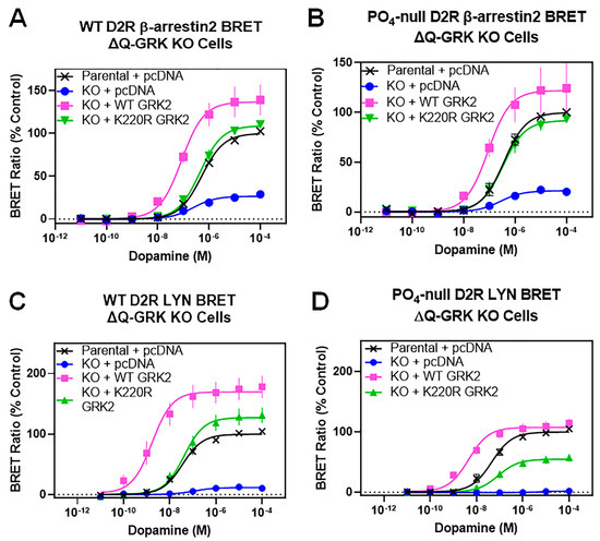The catalytically inactive K220R GRK2 mutant promotes β-arrestin2 recruitment and D2R internalization in ΔQ-GRK KO cells. β-arrestin2 BRET and LYN BRET assays were performed as described in Figure 2C,D and Section 2, using either parental HEK293 cells or ΔQ-GRK KO cells. (A) Plasmids expressing the WT D2R-Rluc8 and either the WT GRK2, K220R GRK2, or pcDNA (control) were transiently transfected into the ΔQ-GRK KO cell line and dopamine-stimulated β-arrestin2 recruitment was measured using a 20 min incubation time. (B) Plasmids expressing the PO4-null D2R-Rluc8 and either the WT GRK2, K220R GRK2, or pcDNA (control) were transiently transfected into the ΔQ-GRK KO cell line and dopamine-stimulated β-arrestin2 recruitment was measured using a 20 min incubation time. (C) Plasmids expressing the WT D2R-Rluc8 and either the WT GRK2, K220R GRK2, or pcDNA (control) were transiently transfected into the ΔQ-GRK KO cell line and dopamine-stimulated D2R internalization was measured using the LYN BRET assay. (D) Plasmids expressing the PO4-null D2R-Rluc8 and either the WT GRK2, K220R GRK2, or pcDNA (control) were transiently transfected into the ΔQ-GRK KO cell line and dopamine-stimulated D2R internalization was measured using the LYN BRET assay. In all panels, data are expressed as a percentage of the maximum dopamine response observed in the parental HEK293 cells and are displayed as mean ± SEM values from at least three independent experiments. Average curve parameters (EC50 and Emax values) and statistical comparisons are shown in Table 7.
