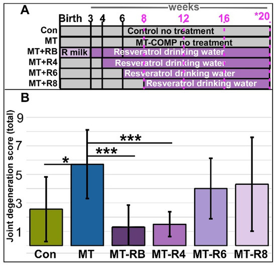 The joint degeneration score in MT-COMP mice was decreased with resveratrol treatment from birth or from 4 to 20 weeks. (A) Experiment design graphic. Male mice were administered DOX from birth to induce the MT-COMP phenotype and treated with resveratrol starting either at birth (MT-RB), 4 (MT-R4), 6 (MT-R6), or 8 (MT-R8) weeks until 20 weeks and analyzed. Timepoints noted in pink denote grooming evaluations. (B) Joint degeneration scoring total is the sum of four scores based on scoring each area from 0–3 (synovitis, femoral proteoglycans, tibial proteoglycans, and cartilage/bone damage). Results were compared to untreated MT-COMP (MT) mice at 20 weeks. MT-COMP mice treated from birth to 4 weeks had significantly improved joint degeneration scores. Ages shown in purple text denote grooming timepoints and asterisk * denotes age at which joint degeneration was evaluated. (Abbreviations: R milk = resveratrol through mother’s milk; Control = Con; MT-COMP = MT; MT-COMP mice treated with resveratrol at birth = M+RB; 4–20 weeks = M+R4; MT-COMP mice treated with resveratrol 6–20 weeks = M+R6). n = 10, * p < 0.05; *** p < 0.0005 (Kruskal-Wallis).