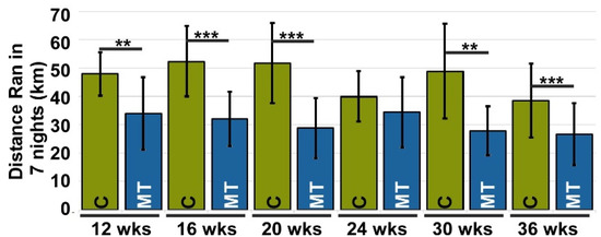 Murine pain was assessed using proxy assays evaluating alterations in instinctive behaviors [33], such as changes in physical activity (voluntary running) and grooming. Changes in voluntary running and grooming were evaluated based on the premise that pain will reduce the number of wheel rotations, or distance run, and grooming efficiency [38]. Each mouse was housed in a cage with a running wheel that measured the distance it ran. Since mice are nocturnal, voluntary running was measured over seven nights after a 3-night acclimation period. Running was assessed at 12, 16, 20, 24, 30, and 36 weeks. Figure 2 and Supplemental Figure S3 show that MT-COMP mice ran significantly less than control mice at each time point, suggesting the presence of pain.