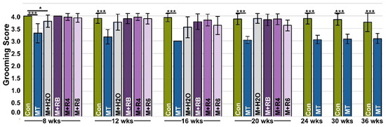 Fluorescent dye (50 μL) was applied on the back of the neck equidistant between ears at time 0, and grooming efficiency was assessed 4 h later in male mice. Animals were imaged and compared to the scoring rubric previously published, with maximal grooming scoring at five [33]. The average grooming scores were analyzed with Kruskal-Wallis with a post-hoc Dwass-Steel-Critchlow-Fligner (DSCF) pairwise test. The standard deviation is represented by error bars in Figure 1.