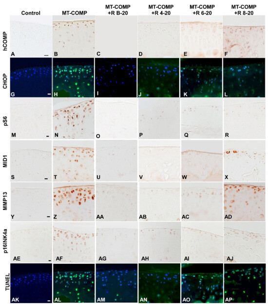 Early resveratrol treatment reduced mutant-COMP pathology in the articular cartilage of MT-COMP mice. All mice (both male and female) were administered DOX from birth to collection for analysis at 20 weeks. Resveratrol was administered from birth to 20 weeks (+R B-20), or 4 to 20 weeks (+R 4–20), 6 to 20 weeks (+R 6–20), or 8 to 20 weeks (+R 8–20). Tibial articular cartilage from control, MT-COMP, and resveratrol-treated MT-COMP mice from each group was immunostained (brown or green signal) for human COMP hCOMP (A–F), CHOP (G–L), pS6 (M–R), MID1 (S–X), MMP13 (Y–AD), pINK4a (AE–AJ), and TUNEL (AK–AP). DAPI (blue signal) shows nuclei in fluorescence images. MT-COMP articular chondrocytes show substantial intracellular hCOMP, CHOP (ER stress marker), pS6 (mTORC1 activity = blocked autophagy), MID1 (increases mTORC1 activity), MMP13 (degeneration marker), and pINK4a (senescence) signals. Resveratrol treatment for 4–20 weeks reduced MT-COMP pathology. Representative images from the analysis of 10 mice in each study group are shown. Bar (all panels) = 50 µm.