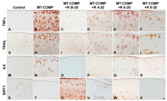 Early resveratrol treatment reduces inflammation and supports chondrocyte survival in the articular cartilage of MT-COMP mice. All mice (both male and female) were administered DOX from birth to collection for analysis at 20 weeks. Resveratrol (R) treatment was given from birth to 20 weeks (+R B-20), or 4 to 20 weeks (+R 4–20), 6 to 20 weeks (+R 6–20), or 8 to 20 weeks (+R 8–20). Tibial articular cartilage from control, MT-COMP, and MT-COMP treated with resveratrol was immunostained (brown) for TNFα (A–F), TRAIL (G–L), IL-6 (M–R), and SIRT1 (S–X). Representative images from the analysis of 10 mice in each study group are shown. Bar (all panels) = 50 µm.