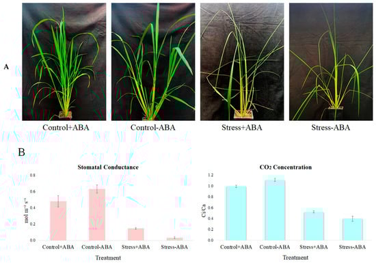 (A) IAC1131 plants used in this study grown under control and multiple abiotic stress conditions, incubated and non-incubated with ABA. (B) Stomatal conductance and ratio of intracellular to ambient CO2 concentration (Ci/Ca); standard errors were obtained from 3 biological replicate measurements.