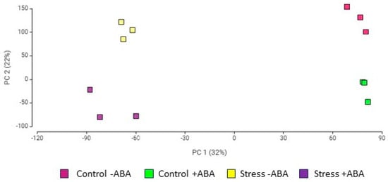 Principal component analysis (PCA) of the transcriptome data from the four groups of IAC1131 plants: (Control − ABA), (Control + ABA), (Stress − ABA), and (Stress + ABA).