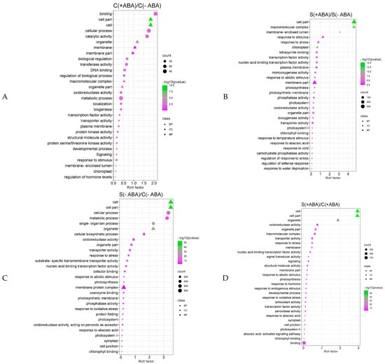 GO enrichment of the DEGs from the four groups of IAC1131 plants. Scatter plot of enriched GO in (A) [C(+ABA)/C(−ABA)] comparison; (B) [S(+ABA)/S(−ABA)] comparison; (C) [S(−ABA)/C(−ABA)] comparison; and (D) [S(+ABA)/C(+ABA)] comparison. Rich factor (x-axis) is the ratio of the differentially expressed gene number to the total gene number in a given enriched GO category. The color and size of the dots represent the range of the -log p-value and the number of DEGs mapped to the indicated enriched GO, respectively.