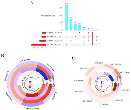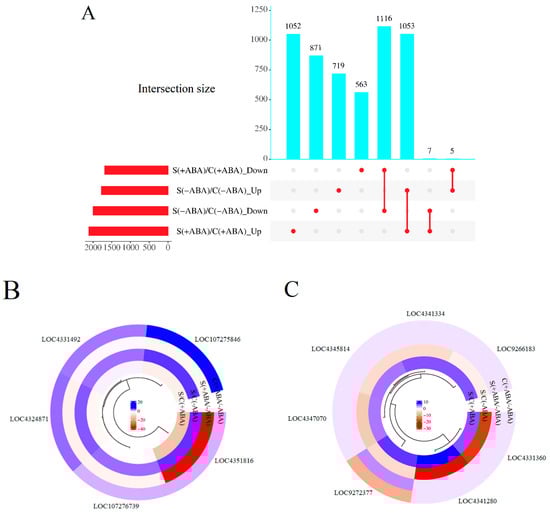 Differentially expressed genes (DEGs) in IAC1131 genotype in ABA-incubated plants relative to non-ABA-incubated plants (control/stress). (A) Upset diagram shows the number of genes up-regulated and down-regulated significantly in [C(+ABA)/C(−ABA)] and [S(+ABA)/S(−ABA)] comparisons. Histograms to the left of each sample set description correspond to the number of differentially expressed genes in each set. (B) Circular cluster heatmap of genes up-regulated in [C(+ABA)/C(−ABA)] and down-regulated in [S(+ABA)/S(−ABA)]. (C) Circular cluster heatmap of genes down-regulated in [C(+ABA)/C(−ABA)] and up-regulated in [S(+ABA)/S(−ABA)].