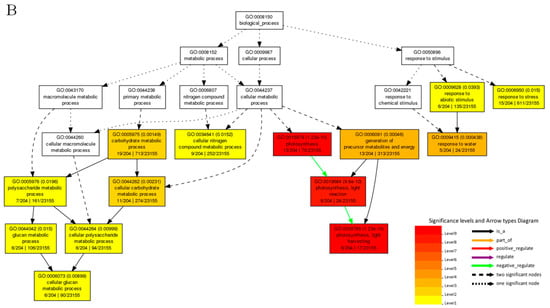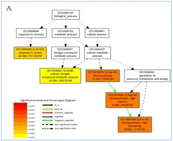 The GO terms ‘photosynthesis’, ‘photosynthesis, light harvesting’, ‘photosynthesis, light reaction’, ‘response to stress’, ‘chloroplast’, and ‘cellular nitrogen compound metabolic process’ were all enriched within DEGs by both SA and (SA and SO) comparisons (Figure 9), but no GO terms were enriched in genes differentially regulated in the (SA and AO) comparisons. Altered regulation of photosynthetic pathways is a common rice response to stress and these results show that ABA accumulation can positively regulate related genes. Importantly, GO functional analysis indicated that photosynthetic activity was decreased under stress treatment and also in response to ABA application. Another finding of enrichment analysis was related to the different levels of enrichment between the SA and (SA and SO) comparisons. The significance level of enriched GO categories related to photosynthesis, photosynthesis (light reaction), and photosynthesis (light harvesting) from SA was lower in common genes also regulated in (SA and SO). Consequently, ABA efficacy in affording plant tolerance against multiple abiotic stress can be seen in the number of DEGs, the number of up-regulated genes, and the enrichment of related biological processes in plants.