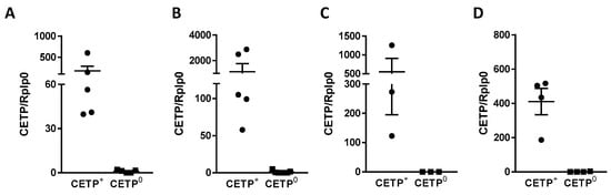 CETP mRNA relative expression in the aorta and spleen of recipient Ldlr−/− mice. CETP mRNA expression in the aorta (A,C) and spleen (B,D) of young male (A,B) and aged female (C,D) Ldlr−/− transplanted mice that received bone marrow from CETP transgenic (CETP+) or non-transgenic (CETP0) donor mice. Internal control: acidic ribosomal phosphoprotein P0 (Rplp0).