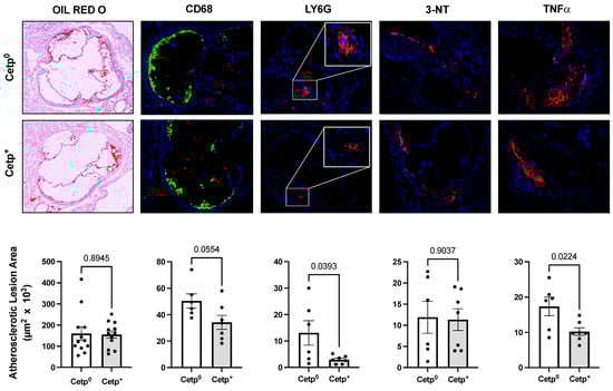 To quantify and characterize the atherosclerotic lesions in the transplanted mice, their aorta roots were stained with Oil Red O (lipid content) and immunostained for CD68 (marker of macrophages and monocytes), Ly6G (marker of neutrophils), TNF-α (classic inflammatory marker), 3-nitrotyrosine (3-NT, marker of nitro-oxidative stress), 8-oxo-7,8-dihydro-2′-deoxyguanosine (8-Oxo-dG, marker of DNA and RNA oxidative damage), and iNOS (marker of M1 pro-inflammatory type of mouse macrophage) (Figure 2 and Figure 3). In the young male Ldlr−/− recipient mice, the CETP-expressing BM (CETP+) did not change the lipid-stained lesion areas compared to the CETP null BM (CETP0) recipient mice (Figure 2). However, the neutrophils (LY6G) and TNF-α content in the recipients of CETP+ BM were significantly reduced, and the macrophage (CD68) content also tended to be reduced in the CETP+ BM recipients (p = 0.055). The oxidized protein (3-NT, Figure 2) and nucleic acid (8-Oxo-dG, not shown) levels did not differ between the young male Ldlr−/− recipient mice groups.