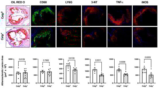 Since the observed lesion sizes in the young male mice were small (~2 × 105 μm2), to confirm and expand these findings, we studied another independent group of recipient mice with more advanced atherosclerosis, namely, aged female Ldlr−/− (15–18 months of age, Figure 3). The lipid (oil red) and macrophage (CD68) contents did not differ between the recipient groups. However, inflammatory markers (LY6G, TNF-α, and iNOS) and the nitroxidation of proteins (3-NT) were markedly decreased in the CETP+ BM aged female Ldlr−/− recipient mice (Figure 3).