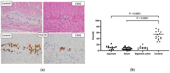 (a): The representative histological findings of HE and Hu C/D staining (at high power field (×400)). Red arrows indicate Hu C/D positive ganglion cells. The samples were obtained from a 4-month-old male patient diagnosed with CIHG (jejunum) and a 4-month-old male control patient (jejunum). A ganglion cell body was only counted if the Hu C/D staining covered the nucleus across at least 50% of the nuclear circumference. (b): The enumerated count of Hu C/D-positive ganglion cells (/cm) in resected specimens of CIHG patients and age-matched controls is shown. Statistical significance was observed in the numbers of Hu C/D-positive cells in both jejunal and ileal specimens of CIHG when compared to those in age-matched control specimens of either the jejunum or ileum.